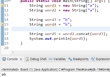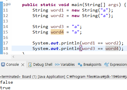 즉 new를 사용하는 방법은 동일 내용을 생성하더라도 서로 다른 객체로 생성 되지만, new키워드를 사용하지 않고 따옴표로 감싸서 생성하는 경우 처음 생성한 대상은 정상적으로 생성되고, 다음에 생성하면 처음 생성된 객체를 참조한다.