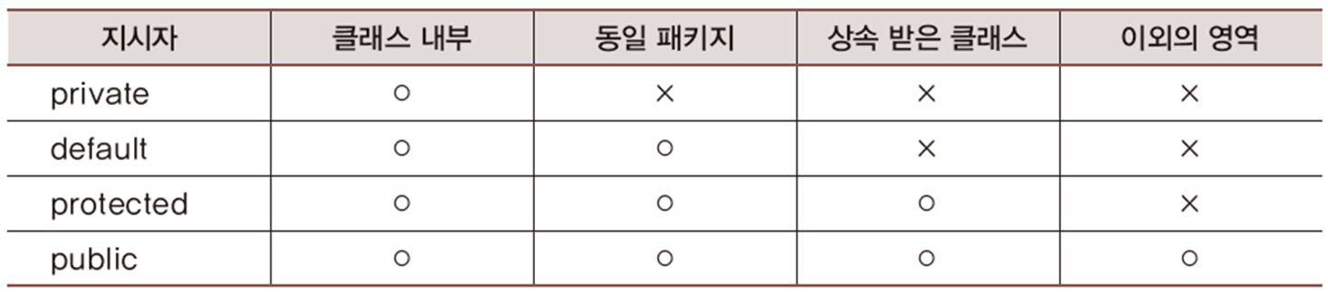 public과 default는 클래스 정의 대상이고, 모든 지시자는 인스턴스 변수와 메소드의 정의 대상이다.