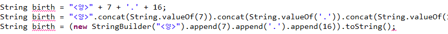 이 경우 valueOf 메소드를 같이 사용해서 concat(String.valueOf(~~))형식으로 사용하면 기본 자료형도 연산 가능하다.