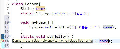 클래스 멤버 sayHello는 인스턴스 멤버 name을 참조할 수 없다.