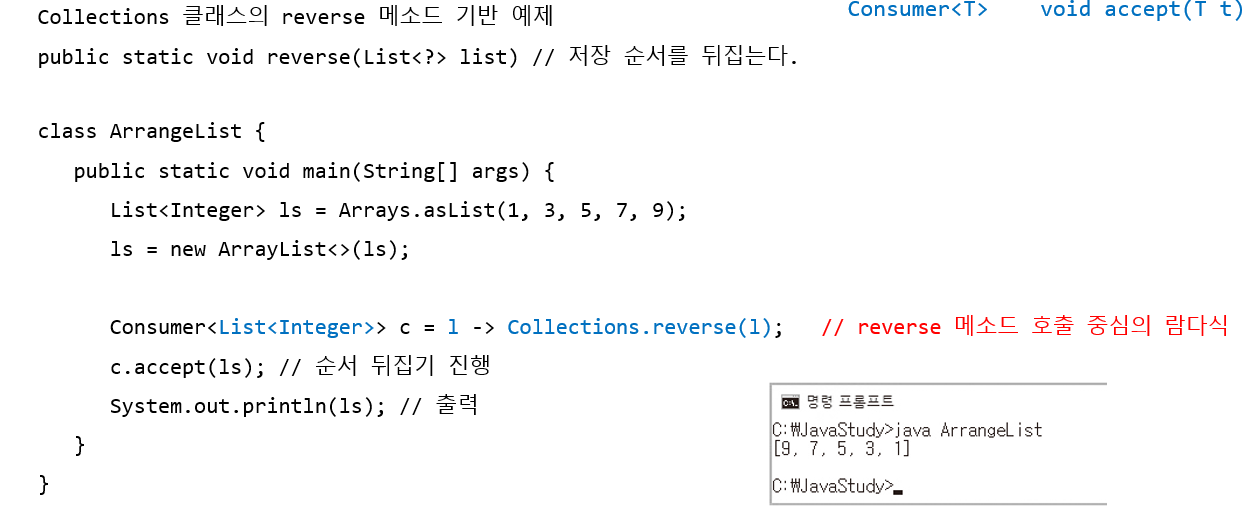 수정을 위해서 인스턴스를 생성하고, 함수형 인터페이스 Consumer에 배열을 뒤집는 reverse 메소드를 호출하는 람다식을 작성 후 Consumer를 호출하여 실행하여 출력하는 코드이다.