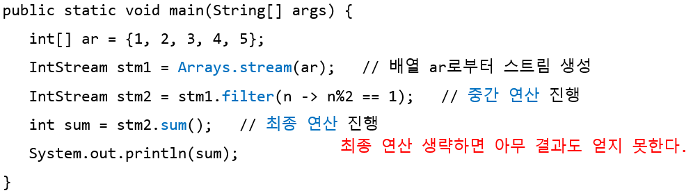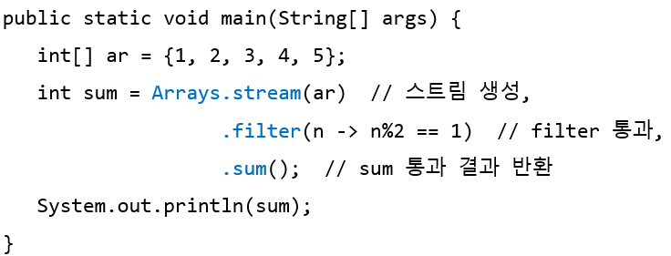 주어진 배열로 부터 스트림을 생성하고, 필터를 통해 홀수만 걸러낸다. 그 홀수를 더하여 총합을 구하는데