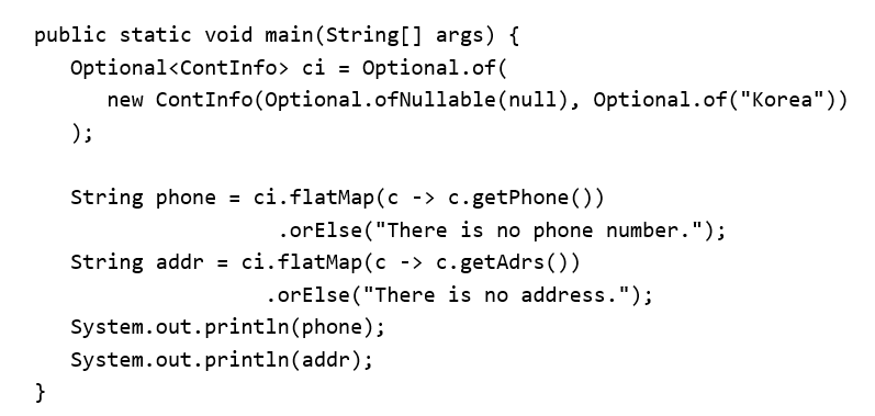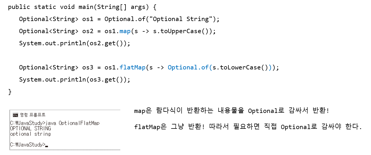 반대로 Optional<String> os3 = ~~ 문장에서 flatmap을 사용한다면 예외가 발생한다. 예외가 발생하지 않으려면 Optional로 감싸줘야 한다.