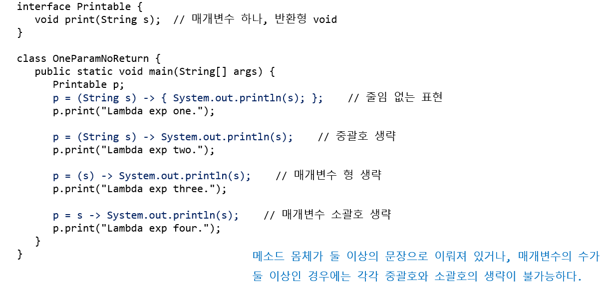 람다의 몸체가 하나의 문장으로 이루어져 있으면 중괄호를 생략할 수 있다.