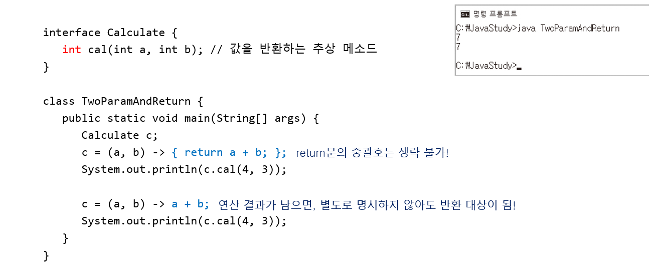 하지만 람다 몸체가 하나이기 때문에 중괄호는 생략가능하다.