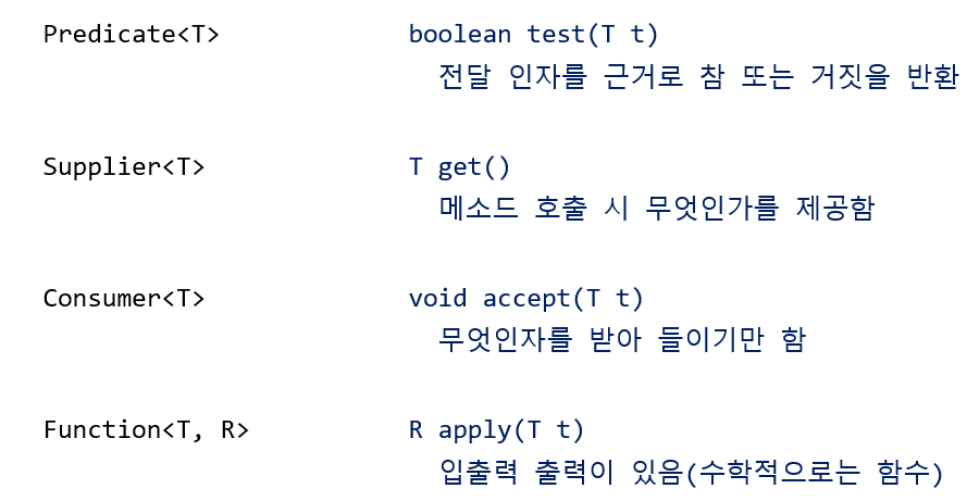 자바에는 미리 정의되어 있는 함수형 인터페이스도 있고, 미리 정의되어 있는 함수형 인터페이스를 사용하는 표준 메소드 및 클래스도 다수 정의되어 있다.