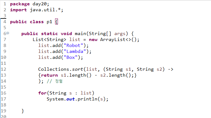 정렬 기준을 만들기 위해 Comparator 인터페이스를 구현하는 클래스를 만들고, compare 오버라이딩한 코드를 람다를 이용하여 작성하면