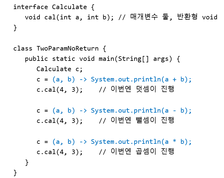 매개변수가 둘 이상이기 때문에 매개변수의 소괄호는 생략이 불가능하다.