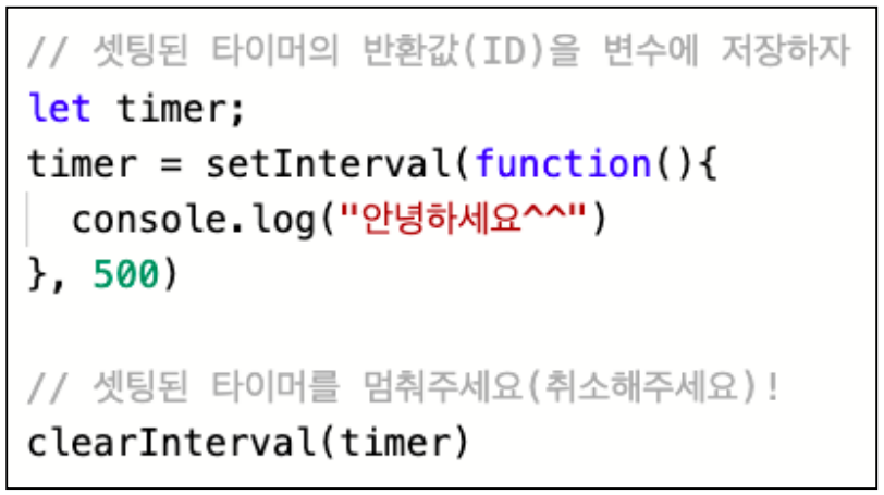 숫자는 타이머의 ID를 의미하며, 이를 clearInterval 메소드에 전달하면 해당 타이머의 반복 실행이 취소된다.