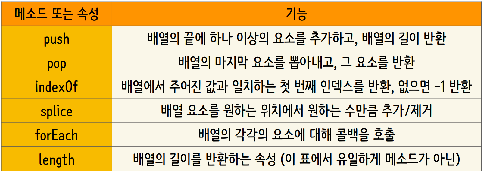•배열은 여러 개의 데이터를 선형적으로 보관하는 객체이다. •배열 리터럴 또는 배열 생성자를 이용해 생성할 수 있다. •배열 요소는 0부터 순서를 매기며, 이를 인덱스 번호라 한다. •인덱스 번호를 통해 각 배열 요소를 참조할 수 있다. •배열 요소는 원하는 개수만큼 포함할 수 있다.