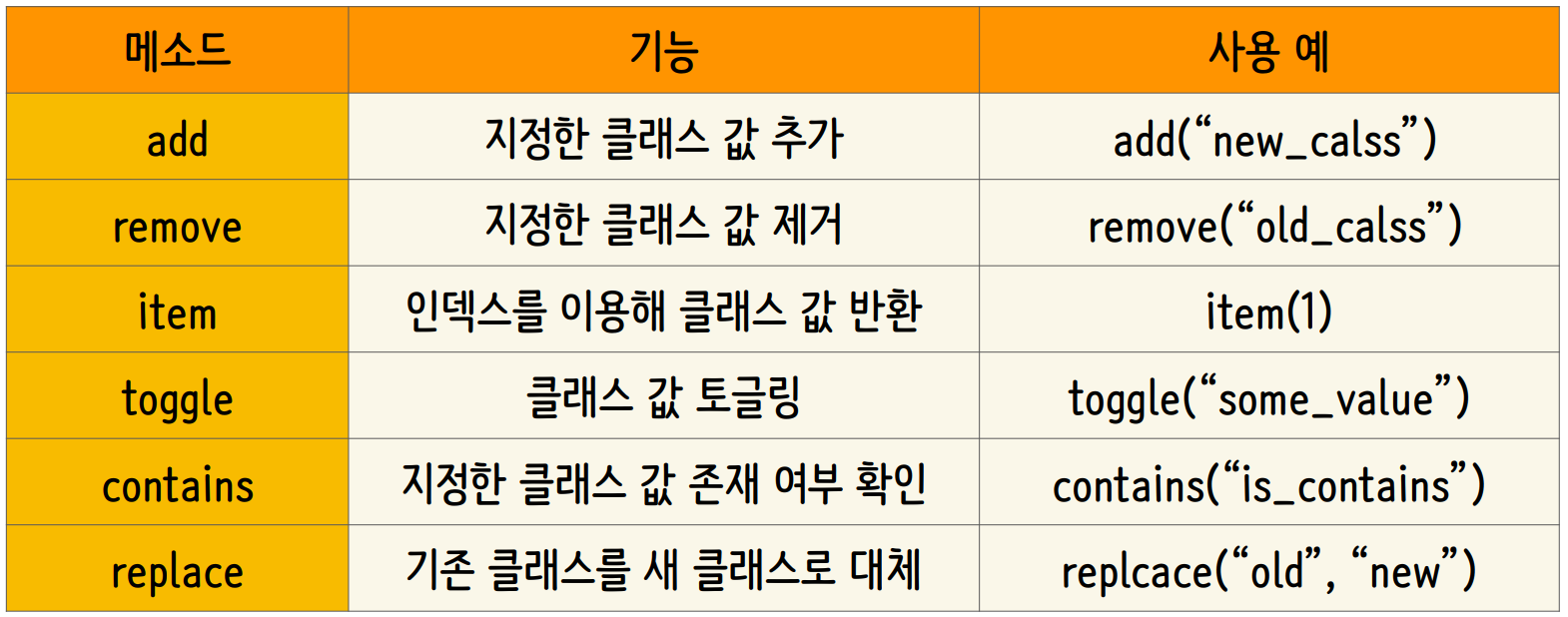 •classList는 요소로부터 클래스 콜렉션을 반환하는 읽기 전용 속성이다. •반환된 클래스 콜렉션은 유용한 메소드를 다수 포함하고 있다. •일반적으로 toggle은 있으면 제거하고, 없으면 생성한다는 의미이다.