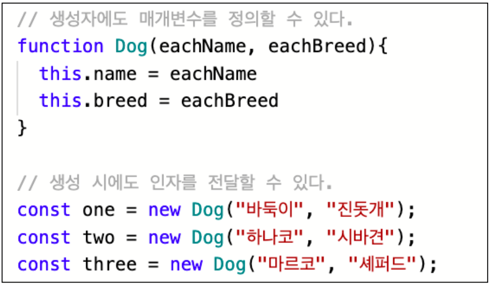 생성자 함수를 정의할 때, 매개변수를 지정하고 생성 시 매개변수를 같이 입력해주면 된다.
