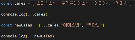 새로운 배열을 선언할 때 스프레드 연산자를 사용하면, 기존 배열의 개별 요소를 멤버로 갖는 배열을 생성할 수 있다.
