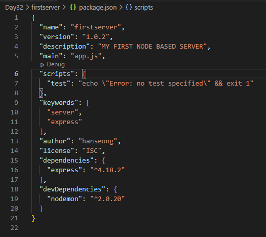 프로젝트 폴더에 설치된 모듈을 비롯한 프로젝트 관련 사항들을 관리하기 위해 노드 프로젝트 폴더 안에는 package.json 이라는 파일을 생성할 수 있다.