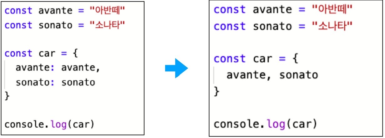 •객체 초기화 시 변수의 이름만 기입하여 키와 밸류를 생성할 수 있다.