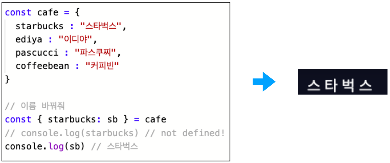 객체의 원래 속성명(키)과는 다른 이름의 변수에 할당할 수도 있다.