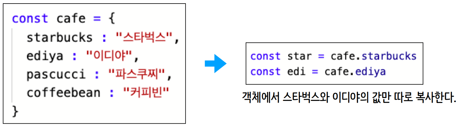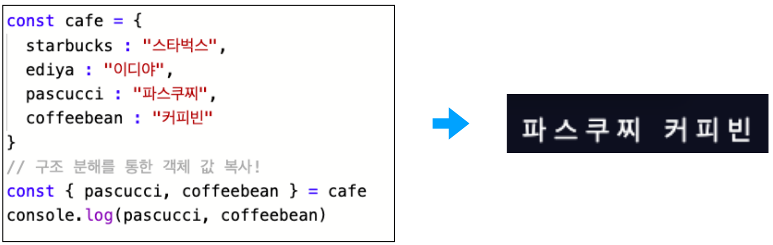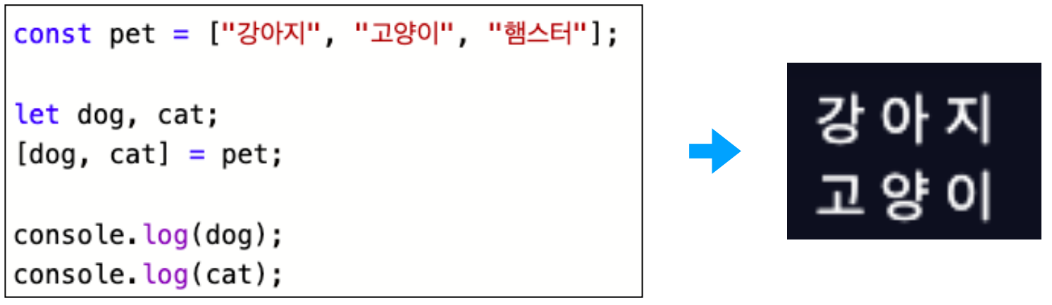 •구조 분해 할당을 사용하면 객체나 배열의 멤버를 변수로 선언할 수 있다.