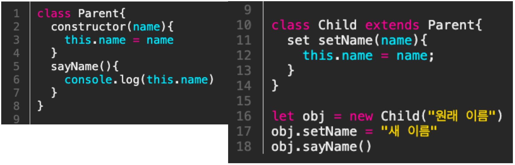 자바스크립트에서 set이라는 키워드로 지정할 수 있고, set을 이용하면 인자를 메소드에 대입할 수 있다.