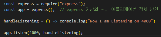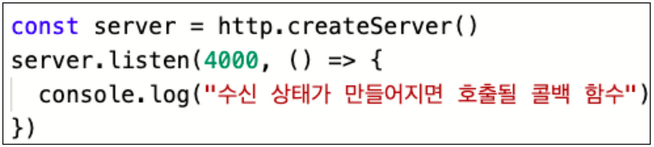 http 서버 오브젝트는 listen 메소드를 호출하여 서버가 시스템의 포트를 수신하도록 한다.