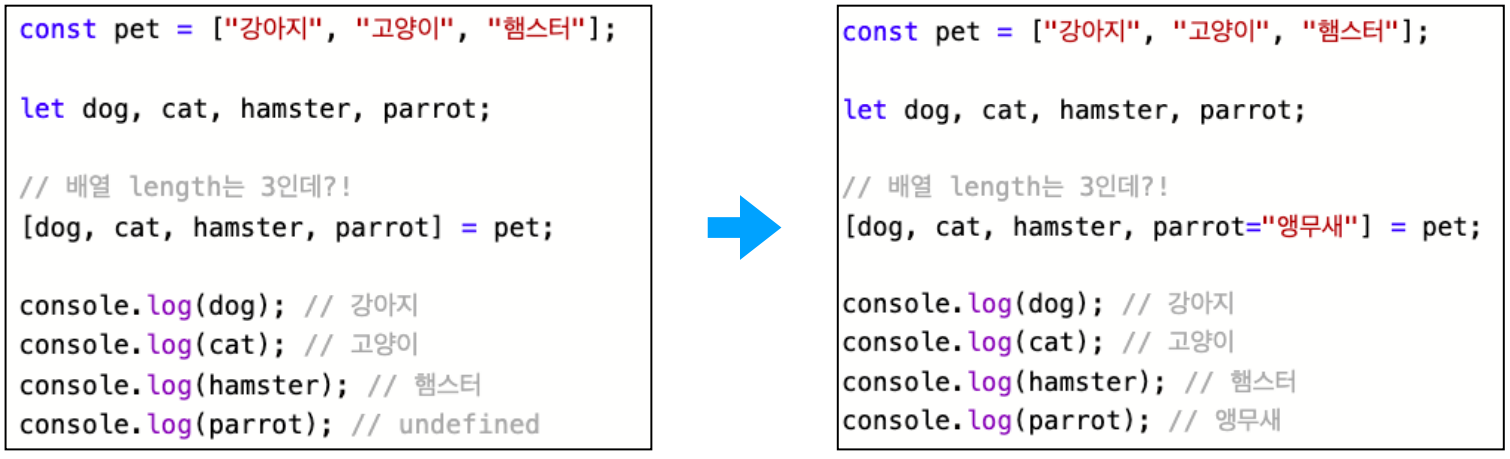 •구조 분해 시 디폴트 값을 선언하여 undefined 값에 대비할 수 있다.
