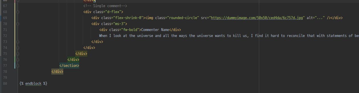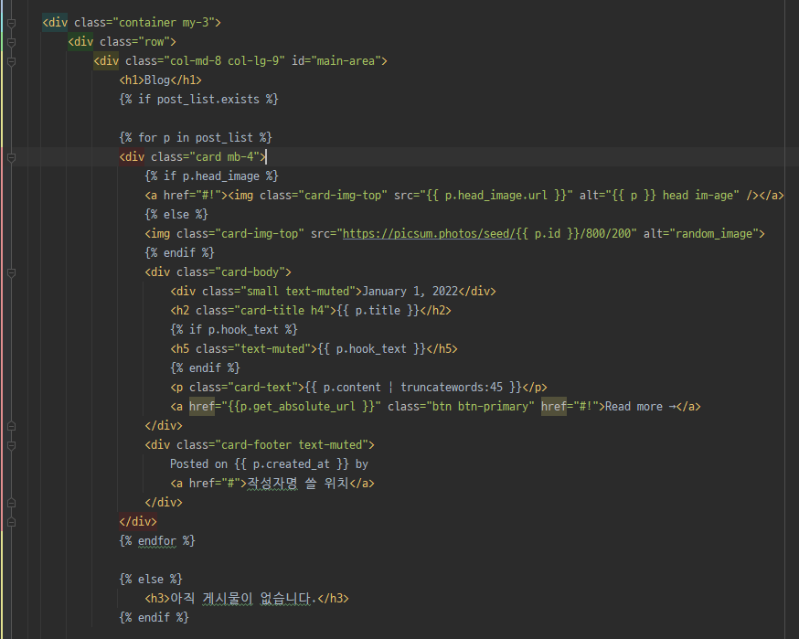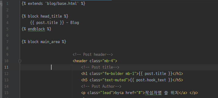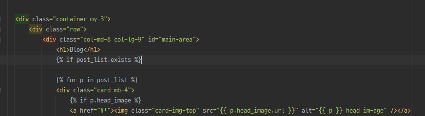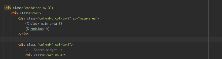 현재 post_detail.html은 <div class="container">안에 <div class="row">가 있고, <div class="col-lg-8">안에 있는 내용만 남기면 된다.
