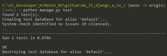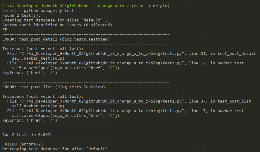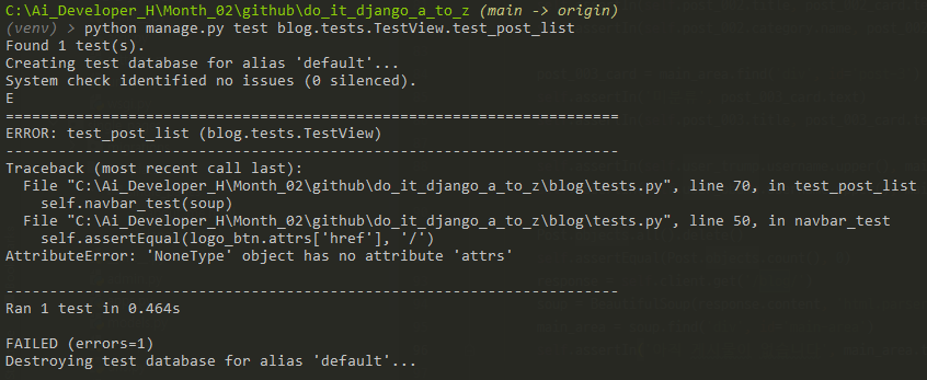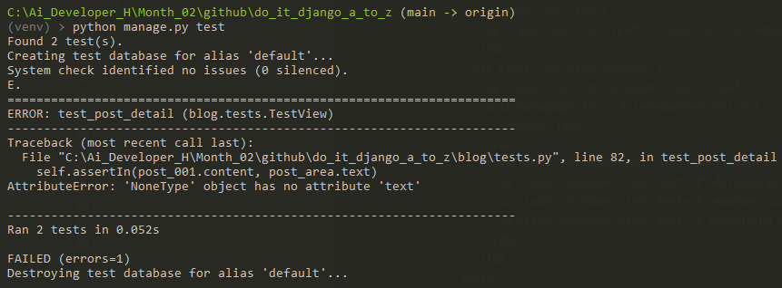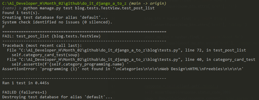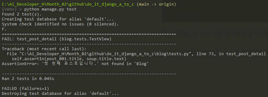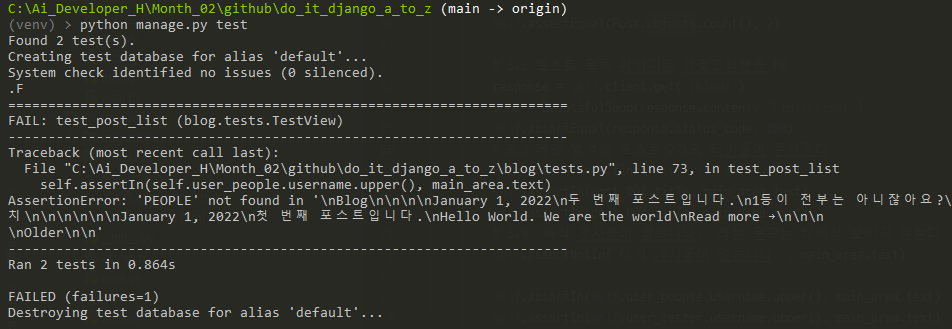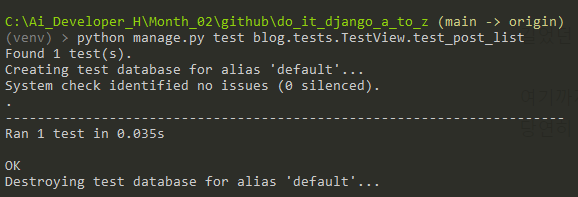 당연히 post_detail.html은 수정하지 않았기 때문에 실패가 뜨기에, test_post_list 함수만 실행한다.