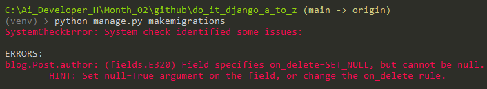 마지막에 수정한 SET_NULL은 null일수 없다고 쓰여있으니, 중간에 null=True 를 추가해준다.