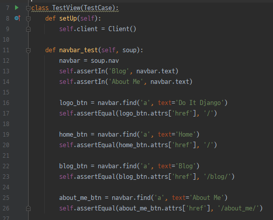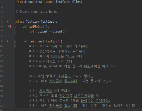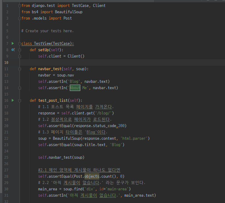 blog/tests.py 에는 이런 형식으로 테스트 코드를 작성할 것이다.