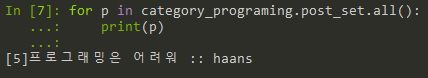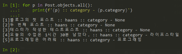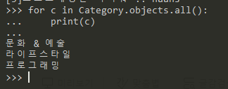 for문을 활용해 데이터베이스에 저장된 모든 Post 레코드와 Category 레코드를 출력해 본다.
