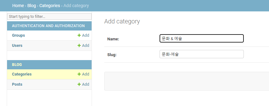 카테고리 모델에는 name과 slug라는 이름의 필드를 만들었다.