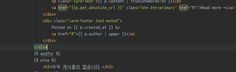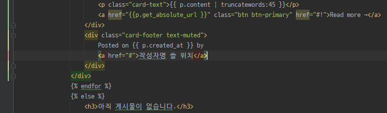 또한 아직 게시물이 없습니다. 라는 문구를 출력하도록 if문을 이용하여 추가한다.