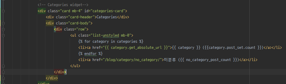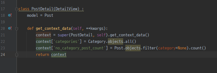카테고리 카드를 채우기 위한 정보를 views.py의 PostDetail 클래스에서 정의해 주지 않았기 때문에 context_data를 이용해 넘겨준다.