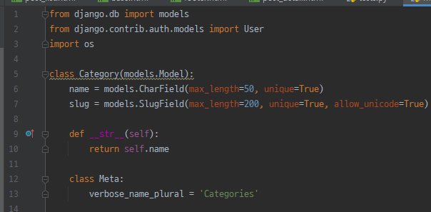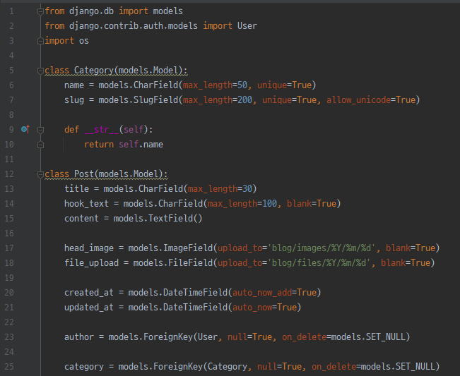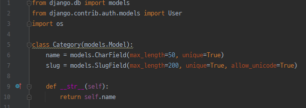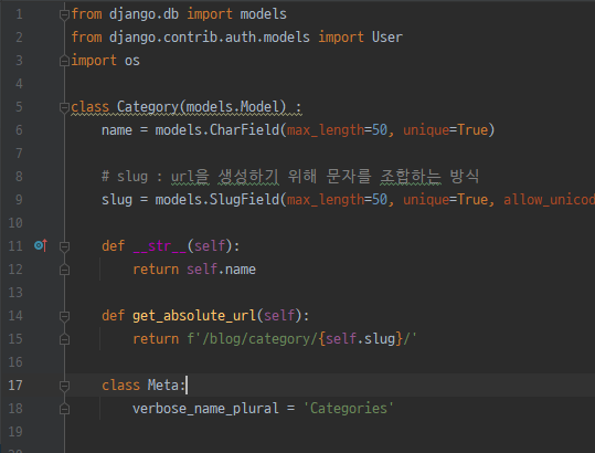 작성자 필드는 장고에서 제공하는 User 모델로 구현했지만, 이번에는 직접 Category 모델을 개발한다.
