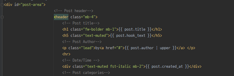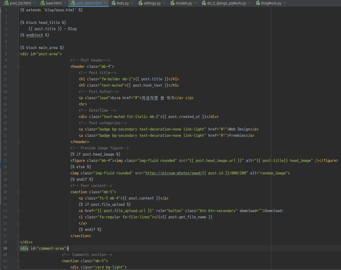 post_detail.html에서 포스트 영역에 해당하는 부분은 id="post-area" 인 <div>태그로, 댓글 영역에 해당하는 부분은 id="comment-area"인 <div>태그로 감싼다.