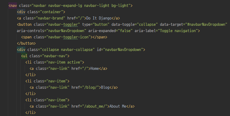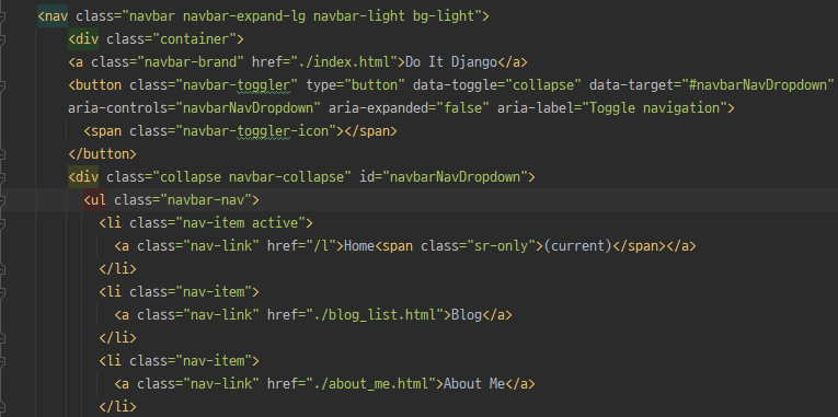 문제의 원인은 base.html의 내비게이션 바 소스코드를 보면, 각 버튼의 링크를 장고의 urls.py에서 처리하지 못하기 때문이다. 이를 urls.py에서 처리할 수 있도록 수정해야 한다.