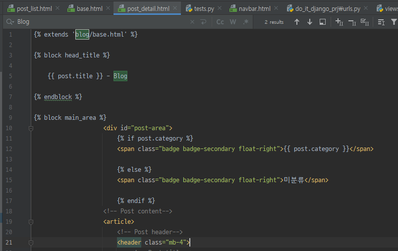 이제 나머지 post_detail.html도 base.html을 이용할 수 있도록 수정한다. 위와 같이 메인 영역에 해당하는 부분만 남기고 다 지운 후 블록을 지정한다.