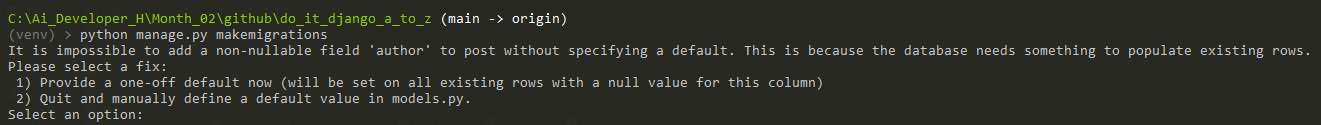 이후 모델을 수정했으니 마이그레이션을 진행하는데 다음과 같은 오류 메시지가 출력된다.