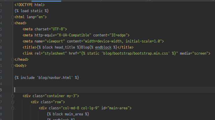 base.html에서 생긴 빈 공간을 {% include 'blog/navbar.html' %}로 채워넣는다.
