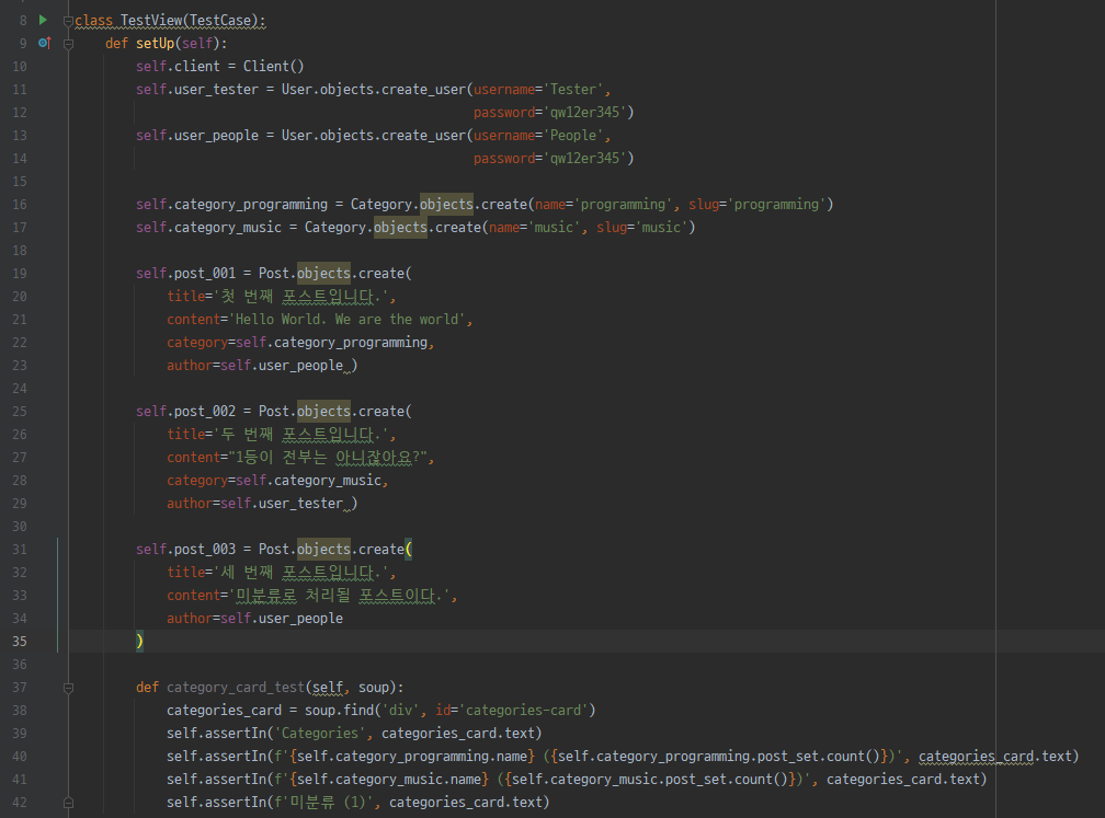 앞으로의 테스트는 미리 생성되어 있는 상태로 진행하기 위해, 다른 테스트함수에서 생성할 포스트들도 setUp()함수로 옮기고, 미분류로 처리될 포스트까지 하나 추가로 생성한다.