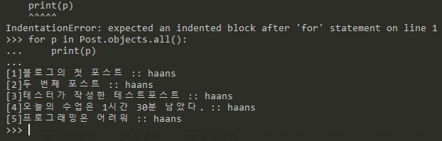 셸 플러스를 이용하면 파이썬 코드에 따라 글자 색상이 다르게 표현되어 가독성이 높아지고, for 문을 사용할 때 들여쓰기도 자동으로 맞춰져 편리하다. 또한 포스트 모델과 카테고리 모델을 import하지 않아도 가져와 쓸 수 있다.