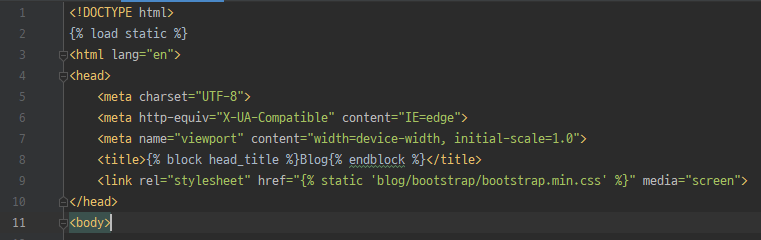 웹 브라우저 위쪽에 나타나는 타이틀이 없다는 것이다. 웹 브라우저의 타이틀은 <head> 태그에 있고, 이 태그는 base.html에 위치해 있다.