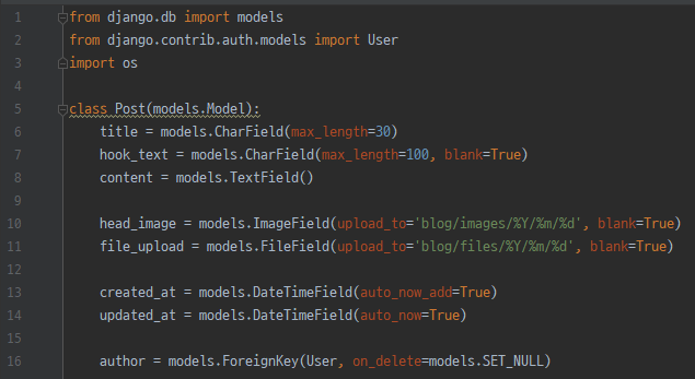 또한 카테고리가 삭제될 때, 연결된 포스트는 삭제되지 않도록 on_delete=models.SET_NULL로 설정한다.