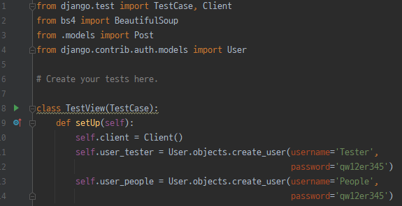 blog/tests.py를 이렇게 수정한다. 이는 테스트용 사용자를 생성하는 코드이다.
