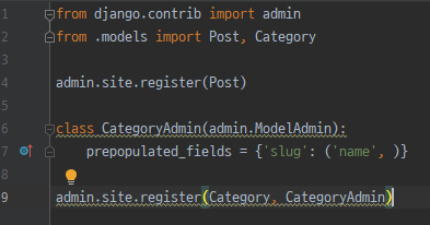 prepopulated_fields = {'slug': ('name', )}이 코드는 카테고리 모델의 name필드에 값이 입력되었을 때 자동으로 slug가 만들어지는 코드이다.