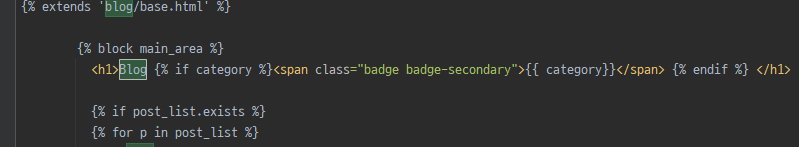 post_list.html에 카테고리 페이지에 추가한 뱃지가 포스트 목록 페이지에서 보이면 안된다. 따라서 다음과 같이 if문을 사용해 카테고리가 context로 넘어올 때만 그 카테고리 이름을 부트스트랩의 뱃지 형태로 출력한다.