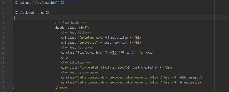 그리고 다음과 같이 {% block main_area %}와 {% endblock %}을 추가하여 블록을 만든다.