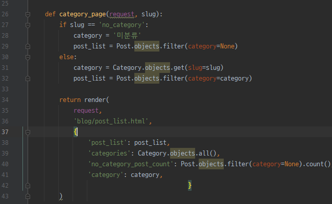 미분류 카테고리를 처리하기 위해서 views.py를 수정하여 category_page()함수의 slug인자로 'no_category'가 넘어오는 경우 카테고리가 없는 포스트만 보여주고, 미분류 라는 문자열만 저장한다.