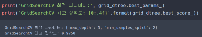 GridSearchCV객체의 fit()을 수행하면 최고 성능을 나타낸 하이퍼 파라미터의 값과 그 때의 평가 결과 값이 각각 best_params_, best_score_속성에 기록된다.
