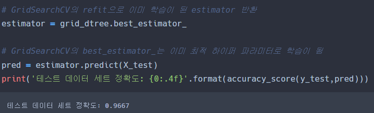 refit=True이면 GridSearchCV가 최적 성능을 나타내는 하이퍼 파라미터로 Estimator를 학습해 best_estimator_로 저장한다.
