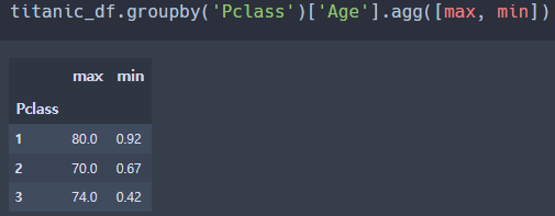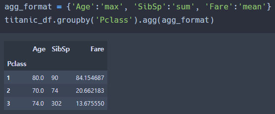 여러 개의 칼럼이 서로 다른 aggregation 함수를 groupby에서 호출하려면 agg() 내에 입력값으로 딕셔너리 형태로 칼럼들과 함수를 입력한다.